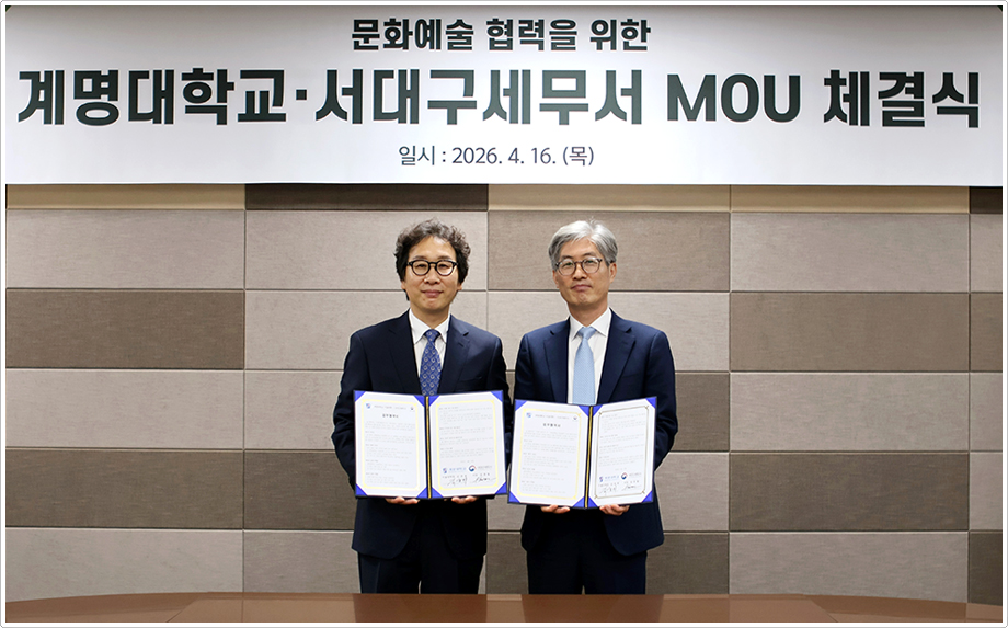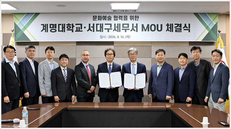 계명대학교 미술대학(학장 김윤희)과 서대구세무서(서장 임종철)는 4월 16일(목) 오전 10시 서대구세무서에서 문화예술 전시 협력을 위한 업무협약(MOU)을 체결했다. 이번 협약은 세무행정 공간을 지역 주민이 문화예술을 향유 할 수 있는 열린 공간으로 확대하고, 지역 예술 인재의 창작활동을 지원하기 위해 마련됐다.